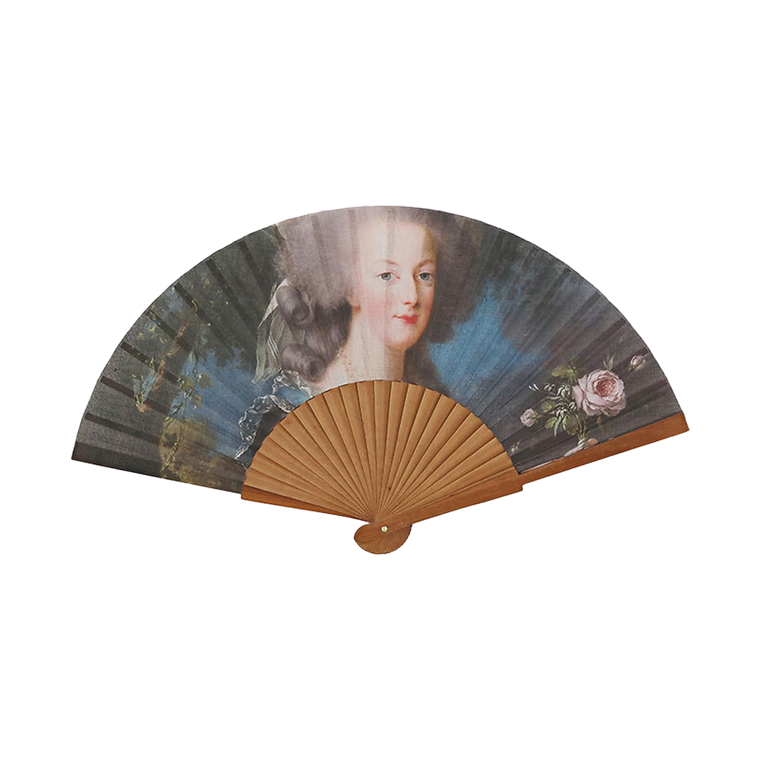 An elegant fan decorated with a reproduction of the oil painting Marie-Antoinette with a Rose, painted by Élisabeth Louise Vigée Le Brun.